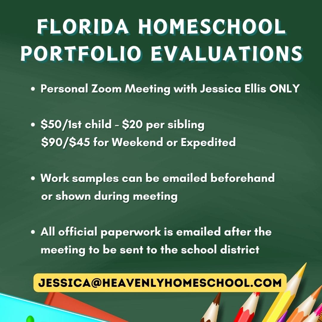 If you are a Florida homeschooling family in need of an evaluator for your annual homeschool portfolio evaluation, look no further! I am a certified homeschool evaluator with over 12 years of experience and would be happy to conduct your portfolio evaluation.